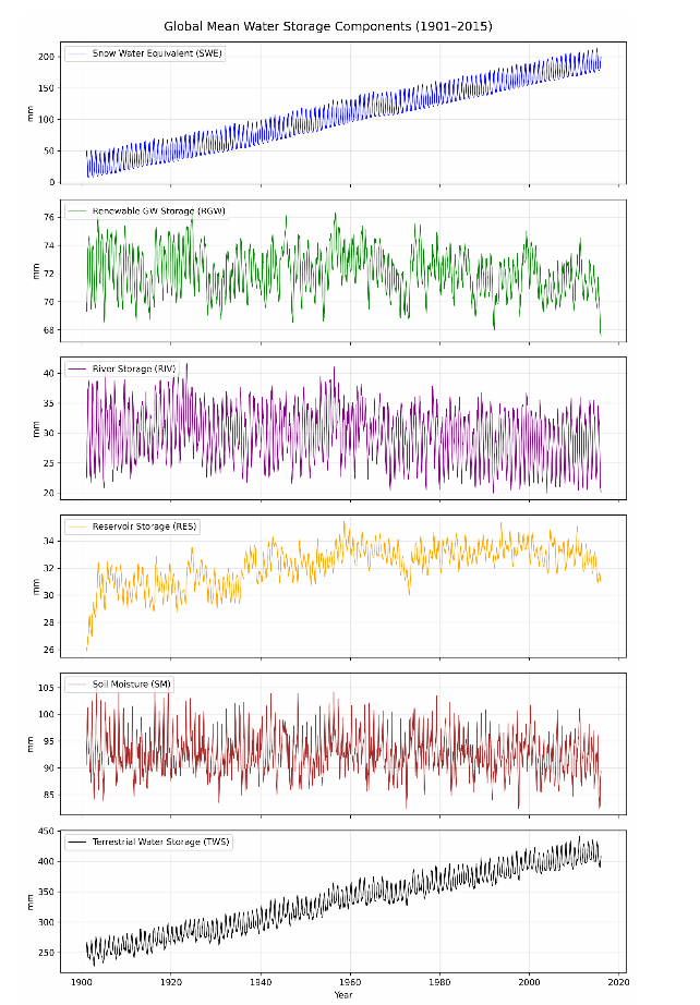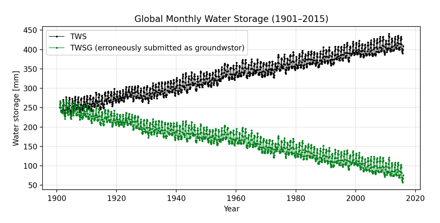 Recently, it was found out that, by mistake, TWSG was reported as groundwater storage (groundwstor). Figure 1 shows the original submissions, including errors. Because the data includes all the storage components, the seasonal amplitude is substantial. They also exhibit a significant decreasing trend due to the constant and continuous groundwater depletion (GWD). Figure 2 shows the resubmissions. The corrected groundwater storage (RGW) shows a regular seasonal cycle with little trend. For reference, all five storage components and TWS are plotted as well.